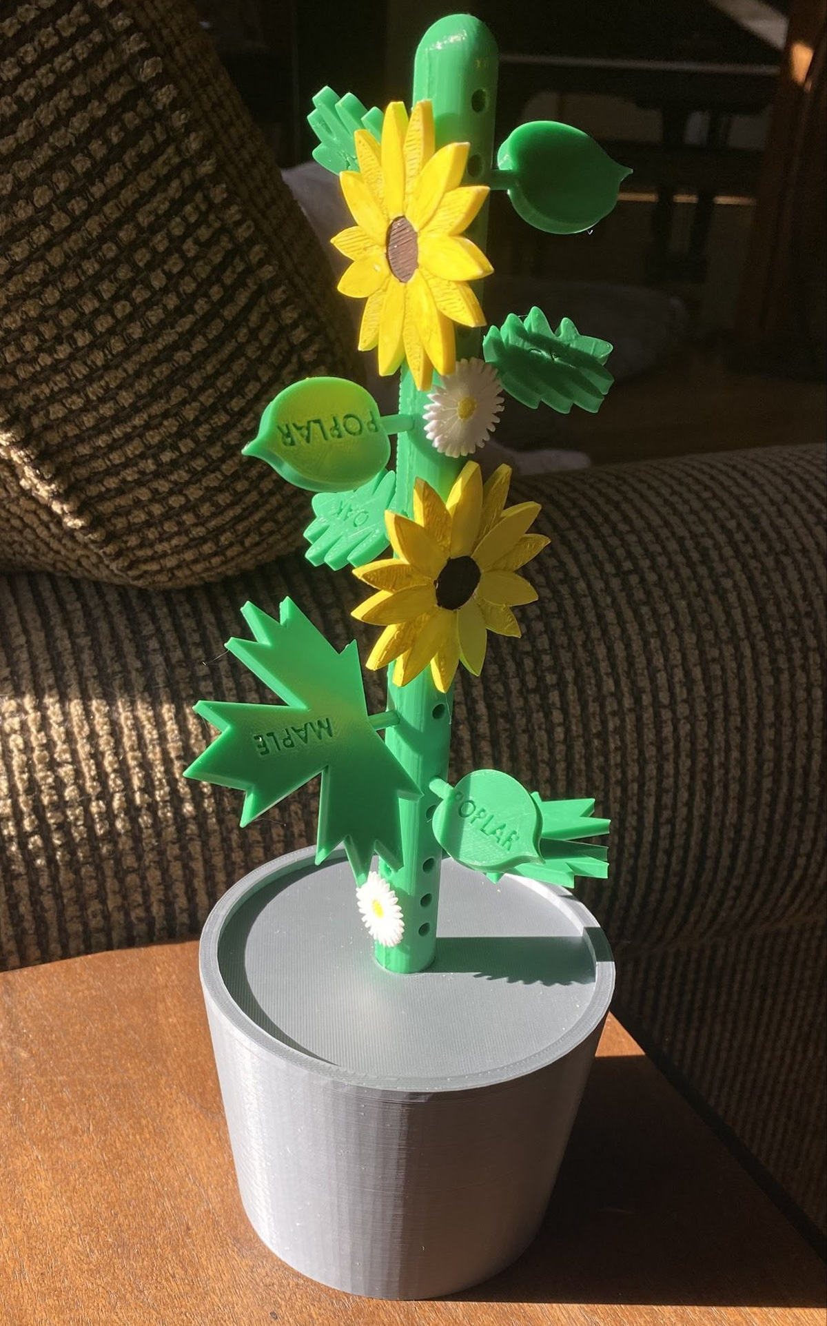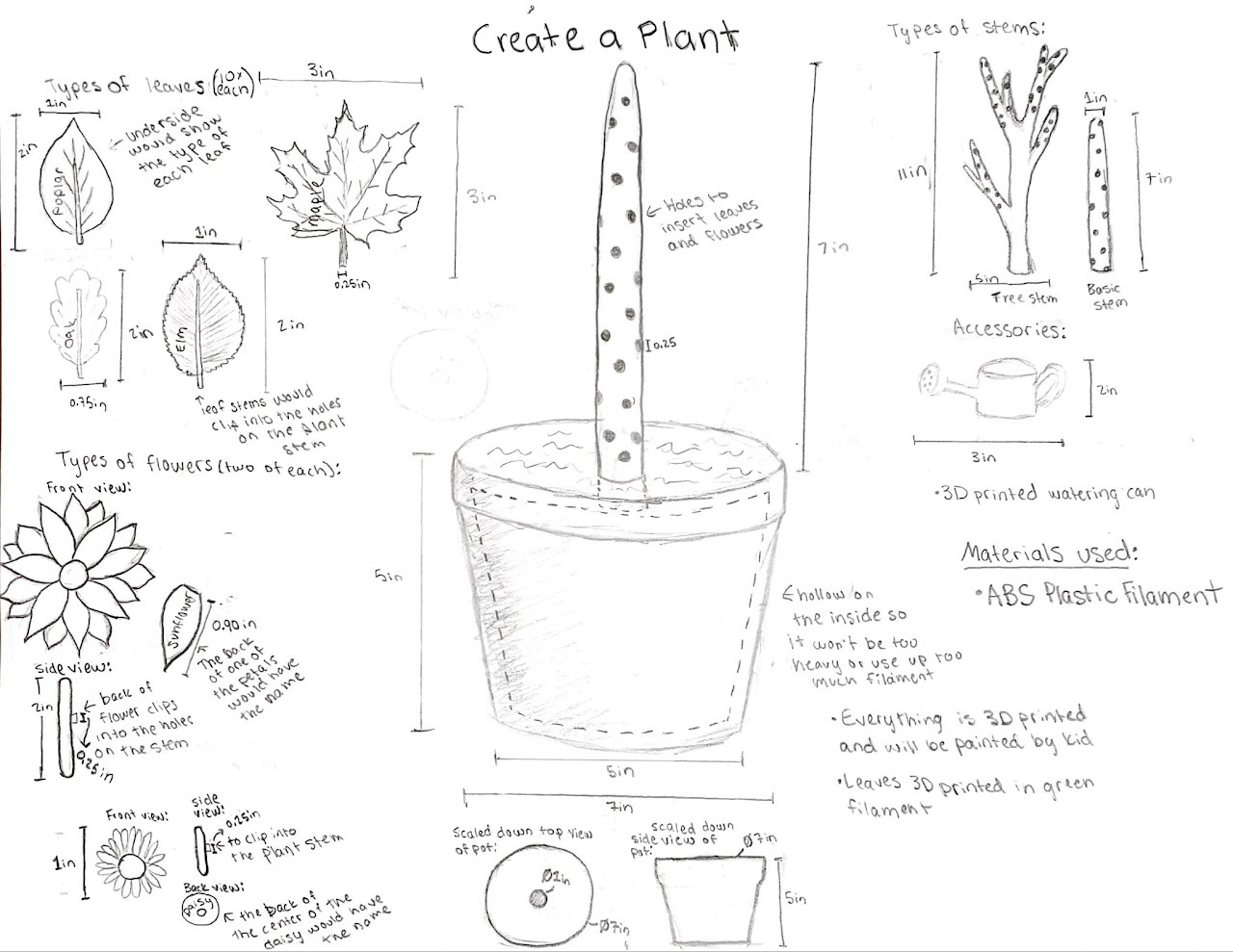I worked with three classmates to create "Create-A-Plant", an educational toy designed for children during the COVID-19 quarantine. The goal was to make a toy that could be built at home for under $25 while being engaging and educational. Create-A-Plant consists of 3D-printed plant parts that children can assemble, with leaves and flowers that interlock with stems and a pot base. Each part is labeled with its name to help children learn about plants. The prototype was made with PLA and ABS plastic and cost $12.64 to produce.