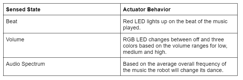 At Oregon State University, I worked with a teammate to create a dancing robot that reacted in three different ways to three sound-based inputs. The robot used a SparkFun Sound Detector to measure sound amplitude and frequency, which triggered changes in LED colors, flashing patterns, and dance movements. We used four servo motors for movement and implemented a fast Fourier transform (FFT) function, EasyFFT, to filter noise, detect beats, and identify common frequencies. A rolling average filter smoothed volume fluctuations to prevent LED flickering. The final system included a robot with two actuators on each side, a breadboard with the sound sensor, an RGB LED that changed colors based on volume, and a red LED that flashed in time with the music’s beat.